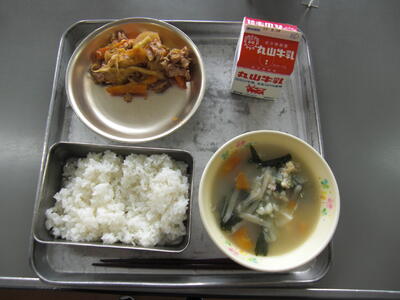 6月13日(火)、今日は、手作りの肉団子が入ったスープです。肉団子は、とりのひき肉と、ぶたのひき肉と、卵、パン粉を混ぜて作ります。全体で、約25キログラムの肉団子のたねを、小さくちぎり、丸めてスープに入れます。たくさんの量のお肉をこね、団子にするのは大変な作業です。給食を作ってくださる調理員さんに感謝して食べましょう。