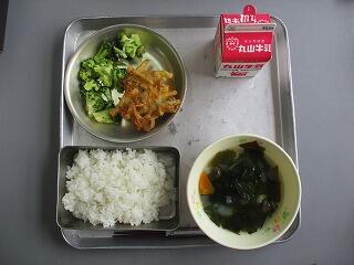 今日の献立は、ご飯、牛乳、豚キムチ丼、千切り大根の酢の物です。