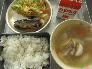 今日の給食は、牛乳、いわしのかんろに、こんぶあえ、ななくさ雑煮です。