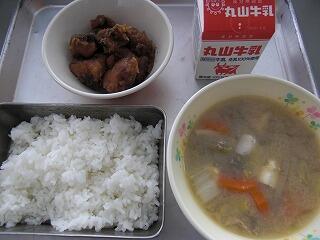 今日の給食は、牛乳、ごはん、とりにくとさといものみそに、ごまあえです。