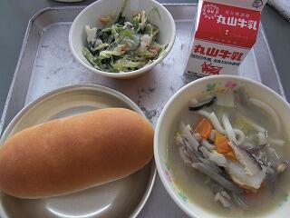 今日の給食は、牛乳、いもっこパン、かぼちゃのミートソース、フレンチサラダです。