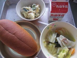 今日の給食は、牛乳、ポテサラサンド、ラビオリスープ、です。