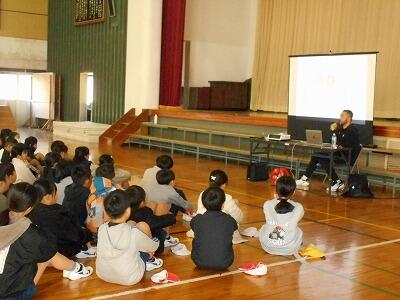 初めに20分程度の「アスリートが語る人生~夢に向かって失敗を恐れずチャレンジする重要性~」と題して講話がありました。中川さんがバスケットボールに出会い、楽しさもありながら、これまでの失敗や挫折を味わってきたことをプレゼン資料で示しながら、説明していただきました。そして、それでも諦めずに前向きにチャレンジしていくことの大切さを5年生のみんなに話していただきました。