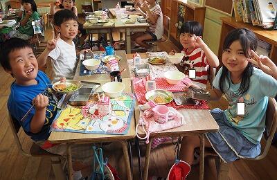 今日は、なす、かぼちゃ、ズッキーニのたくさん入った夏野菜カレーです。夏の暑い日には、カレーライスが食べやすく、子ども達も「カレーがおいしいです!」「なすも全部食べられました!」と夏野菜カレーをもりもりと食べていました。カレーのピリ辛さとパインサラダの甘さがほどよく今日もほとんど残菜はありませんでした。子ども達が苦手とする、なすやズッキーニも入っていましたが、カレーの中に入れることで野菜が苦手な子ども達もおいしく食べられたようです。1年生の教室では、鼻歌を歌いながらご機嫌そうに食べている子どももいました。