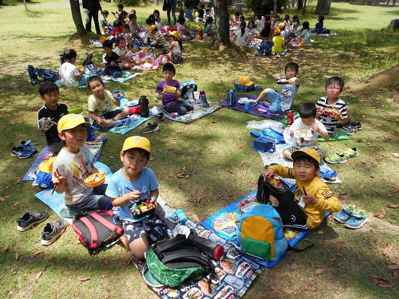 1年生は、小学校に入学して初めての遠足でした。学校から歩いて城山公園に行きました。お弁当の話や行ってから何をして遊ぶかなど、楽しそうに話しながら行きました。城山公園では、南小の1年生や南方小の2年生も遠足に来ていましたが、譲り合いながら仲よく遊んだりお弁当を食べたりすることができました。学校まで帰るときには、少し疲れた様子で、口数が少なくなっていましたが、初めての遠足はとても楽しかったようです。