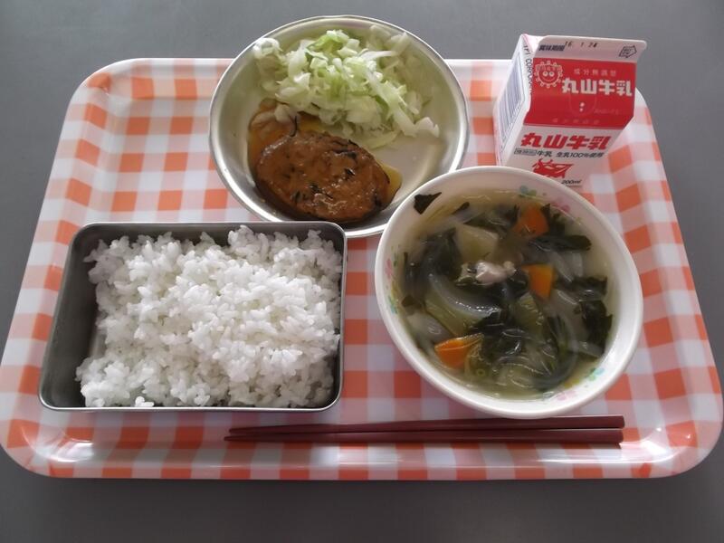 1月18日(月)献立:ごはん 牛乳 ハンバーグ そえやさい はるさめスープ
