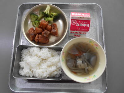 11月8日(火)、献立名(さかなのバーベキューソース・ブロッコリー・けんちんじる)今日は、「しいら」という魚を油で揚げて、たまねぎ、しょうが、にんにく、りんごのみじん切りと、しょうゆ、ケチャップ、レモン汁などの調味料を混ぜて作ったソースでからめています。味付けをみなさんが食べやすいように工夫したソースなので、おいしく食べてもらえると思います。里いも、ごぼう、大根などの入った具だくさんのけんちん汁と組み合わせました。残さず食べましょうね。