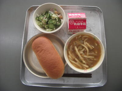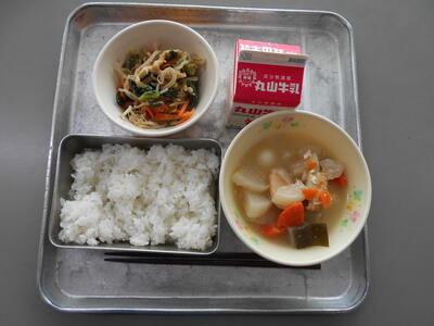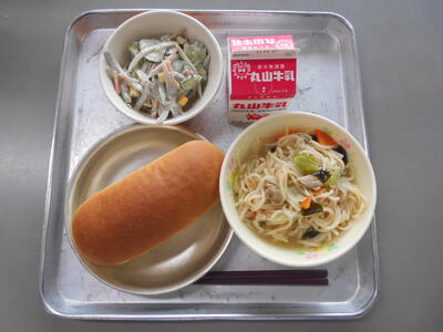 11月10日(金)、献立名(いそちゃんぽん・かみかみごぼうサラダ)今日は、ちゃんぽんについてのお話です。ちゃんぽんとは、豚肉やいか、野菜を具とした麺料理です。長崎のちゃんぽんが有名ですね。いろいろなものを混ぜることを「ちゃんぽん」といいますが、この料理も混ぜる、ごちゃまぜにする・・・ということが語源ではないかといわれています。今日のちゃんぽんは、豚肉や、かまぼこ、たまねぎ、にんじん、もやし、キャベツ、ねぎなどたくさんの具材が入って、栄養満点ですよ。えび、いか、わかめを入れているので、「磯チャンポン」です。