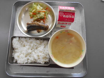 11月13日(月)、献立名(いわしのうめに・そえやさい・みそしる)今日は、いわしについてのお話です。いわしの脂肪には、血液の中の悪いコレステロールを減らして、血液の固まりをなくし、サラサラな血液にする働きがあります。また、血圧を安定させて、肝臓を丈夫にするタウリンも多く入っています。また、鉄分も多く、貧血を防ぐ働きもあります。今日は、魚の臭みをとるため、梅と一緒に煮込んだ料理です。