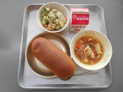 11月14日(火)、献立名(ミネストローネ・セサミサラダ)今日は、ミネストローネについてのお話です。ミネストローネは、イタリア発祥の野菜スープです。イタリアの代表的な家庭料理であり、その材料は地域や季節、家庭によって様々で、どの材料を入れなければいけないという決まりはないそうです。一般的には、トマト、オリーブオイル、ベーコン、玉ねぎが基本の材料とされ、他にはにんじん、キャベツ、じゃがいもなどが使われ、パスタや米などが入ることもあるようです。今日の給食では、豚肉、ベーコン、たまねぎ、トマト、にんじん、しめじ、じゃがいも、それから貝殻の形をしたシェルマカロニを入れています。おいしく食べてもらえるとうれしいです。