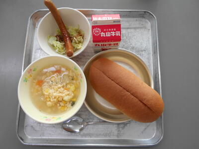 11月21日(火)、献立名(ウインナードッグ・ボイルキャベツ・ふわふわスープ)今日は、パンにウインナーをはさんで食べるメニューです。そこでウインナーのクイズを出したいと思います。ウインナーの名前の由来は次のうちのどれでしょうか?①ウィーンさんという人が考えたから。②ウィーンという地方で作られたから。③勝つという意味の英語ウィンがもとになった。答えは②の「ウィーンという地方で作られたから。」です。オーストラリアのウィーンという地方で作られたので、ウインナーと呼ばれるようになったそうですよ。