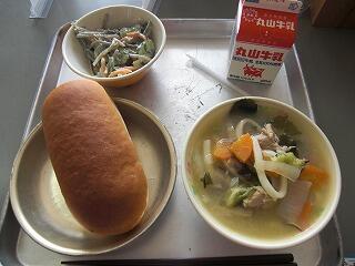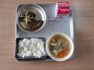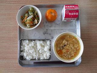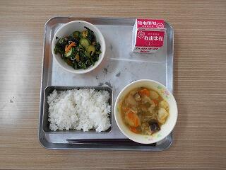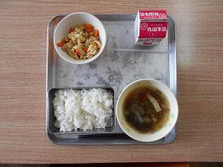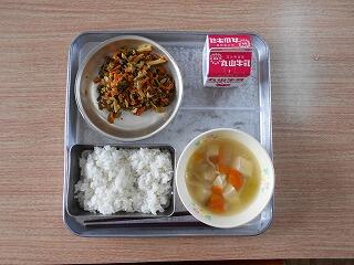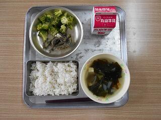 今日の献立は、牛乳、ご飯、はちはい汁、イワシのしょうが煮、添え野菜です。