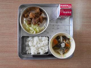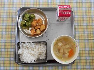 今日は、宮崎県産のかんぱちを油で揚げて、さとう、ケチャップ、ソース、青のりなど「たこやき」と同じ味のタレでからめた料理です。味はいかがですか?宮崎県産の「かんぱち」は、給食応援物資として提供していただいた物です。スープは、チンゲンサイやしめじ、にんじんなど具だくさんにしています。野菜もしっかり食べましょうね。