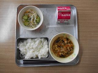 今日の献立は、牛乳、ご飯、マーボーどうふ、いかともやしのナムルです。