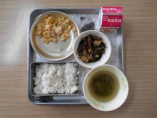 今日の給食は、牛乳、ごはん、豚肉のしょうが焼き、かきたま汁です。