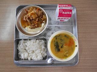今日の給食は、牛乳、ご飯、とりにくとだいずのにもの、こまつなのおひたしです。