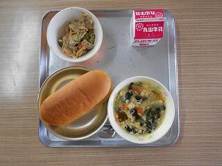 今日の給食は、牛乳、パン、豆乳のクリームスパゲティ、つぼみふっくらサラダです。