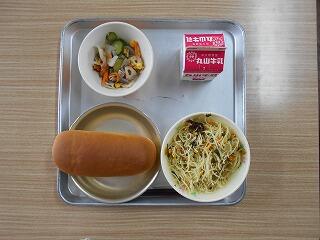 今日の給食は、牛乳、パン、しおやきそば、かいそうサラダです。