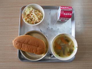 今日の献立は、牛乳、サラダパン、ミートボールのスープにです。