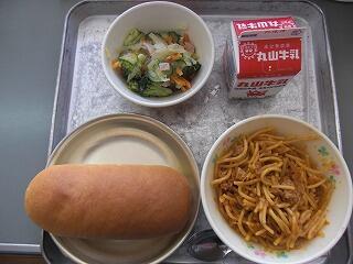 今日の献立は、牛乳、減量コッペパン、なすとひき肉のスパゲティ,コーンのサラダです。