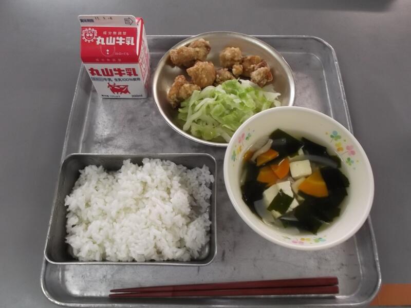 8月31日(月)献立:ごはん 牛乳 とりにくのからあげ ゆでキャベツ すましじる