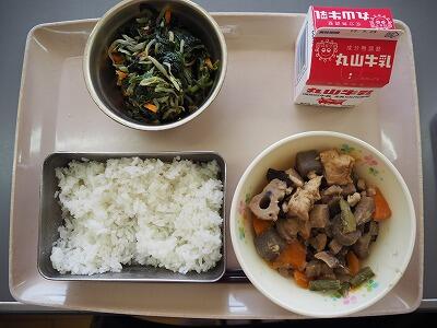 今日は、れんこんやごぼう、かみごたえのある食材のたくさん入った煮物でした。しいたけのだしも加わり、3時間目頃からは給食室からのいいにおいが学校中に広がっていました。今日も残菜はほとんどなくよく食べていました。