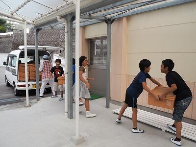 ごはん箱の回収に来て下さった業者の方へごはん箱を渡すところです。給食委員会の子どもたちが自らすすんで毎日お手伝いをしてくれます。業者の方も、「岡富小学校の子どもたちは優しいですね!いつもありがとうございます。」と喜んで下さいます。
