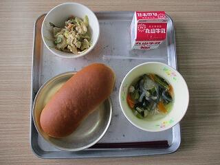 今日の献立は、ミルクパン、牛乳、マロニースープ、ぶたにくのごまみそマヨネーズです。