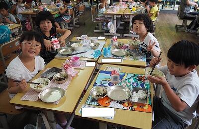 今日は、鹿児島県奄美大島の郷土料理、「鶏飯」です。とりささみ肉と卵、たくあんの入った鶏飯の具を、しいたけ、ねぎの入っただし汁の中にご飯と一緒に入れて食べます。お茶漬けのような感覚でさっぱりと食べられるので今日のような暑い日にもぴったりのメニューです。1年生は食べ方に戸惑う子もいましたが、食べ方を教わり上手に食べることができました。