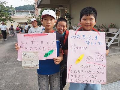 運営委員会の子どもたちは、挨拶運動と一緒に右側歩行への呼びかけも行っていました。岡富小学校では、右側歩行を意識するために、廊下や階段に折り鶴を設置し、全校で右側歩行を意識する取り組みを行っています。