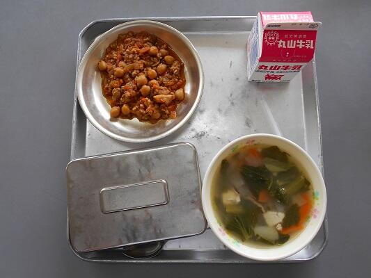 豆には、みなさんの体の筋肉や血を作ったり、体を丈夫にする栄養素があり、お腹の中をきれいにする働きもあります。豆の種類もいろいろあります。「あずき・だいず・白いんげん豆・そら豆・黒豆・えんどう豆・・・」。今日は、ひよこ豆を使った給食です。苦手な人もいるかもしれませんが、自分の体のために、がんばって食べましょう。
