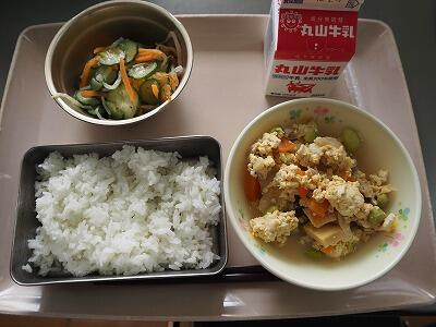 今日は、豆腐と卵の甘み、しいたけだしなどがたっぷりの炒り豆腐と、食用くらげを使ったくらげの酢の物です。「くらげがコリコリでおいしいです!」「茎わかめみたい~!」コリコリとした食感のくらげが子どもたちにも人気で今日もほとんど残菜はありませんでした。