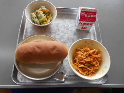 4月21(金)、今日は、スパゲッティについてのお話です。スパゲッティはパスタのなかまです。日本にパスタが伝わったのは、明治時代です。イタリア帰りのシェフがレストランのメニューにいれたのが始まりです。日本で一般的に食べられるようになったのは、昭和30年頃からです。そのころのメニューは、「マカロニサラダ」とか「ミートソース」「ナポリタン」でした。今日は、みじん切りのたまねぎやにんじん、豚挽肉を炒め、ケチャップソースで味付けしたみなさん大好きなミートソースです。宮崎県産の千切り大根を入れたことから、「ひむかミートスパゲティ」とネーミングしました。千切り大根を加えたことで、おなかの調子を良くしてくれる食物繊維がぐーんとアップしました。