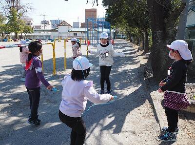 運動場では今日も子どもたちが元気いっぱい遊んでいます。1年生の子どもたちも二重跳びの練習を頑張っていました。