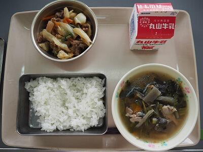 今日は、暑い日にぴったりのスタミナメニューです。焼き肉風は、牛肉とピーマン、キャベツ、人参、玉ねぎを甘辛いみそ味のタレで炒めています。子ども達も「焼き肉風がおいしい!」「ピーマン苦手だけど全部食べられました!」と喜んで食べていました。おいしさの秘訣は、タレにもあり、タレの中には、すりおろし玉ねぎとすりおろしりんごが入っています。この玉ねぎとりんごの甘みがより一層おいしさを高めています。また、今日の汁には、梅肉が入っていたことから梅の香りと梅の酸味がさっぱりとおいしい味わいとなっていました。梅の酸味が苦手な子もいましたが、梅の酸味にはクエン酸といって疲れをとる力もあります。これからの季節は、気温も高くなり疲れやすい時期でもありますので、梅やレモンなどさっぱりとした味わいのものがおいしいですね。