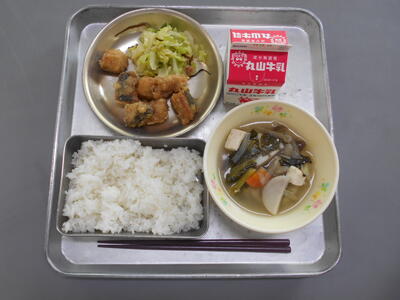 12月6日(水)、献立名(さかなのゆずみそかけ・こんぶあえ・とりごぼうじる)今日は、魚にかたくり粉をつけて油で揚げた料理です。今の季節にたくさんとれる、旬のゆずの皮をみじん切りにしたものと、果汁を、みそに混ぜて作ったタレでからめています。ゆずの良い香りが、魚の臭みを消して、美味しく食べてもらえると思います。魚は、あじです。もちろん国内産です。汁物は、食物繊維たっぷりのとりごぼうじるです。