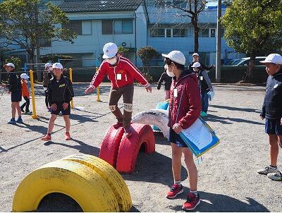 6年生と1年生が楽しそうに過ごす様子はとても微笑ましいものですね。体育委員会の子どもたちも応援しながらタイムを計ったり、ゴール地点までたどり着けたか確認してくれています。