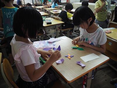 昼休みの様子です。1年生教室を覗いてみると、折り紙で手裏剣を作っている子ども達がたくさんいました。