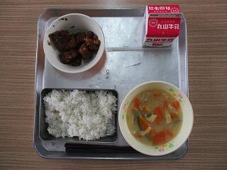 今日の献立は、ご飯、牛乳、豆乳みそ汁、揚げかつおのかおり揚げです。