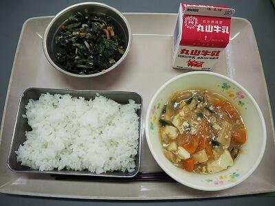 今日は、豆腐、かまぼこ、とり肉、玉ねぎ、人参、たけのこ、しいたけ、にらなどたくさんの食材のうま味が凝縮された豆腐の中華煮です。味付けには、オイスターソースやごま油も入ることでコクのある味わいとなっています。また、サラダには、子どもたちが苦手とする小松菜やほうれん草もたっぷり入れていますが、ツナも一緒に加えることで野菜が苦手な子どもたちにも食べやすいよう工夫しています。