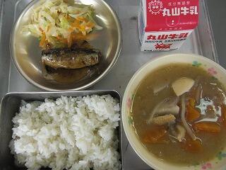 今日の給食は、牛乳、ごはん、いわしのしょうがに、そえやさい、ごまキムチじる、です。