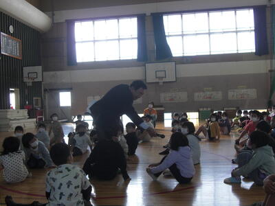 2年生が、生活科の町探検の学習の一環として、山下新天街のカネトふとん店の石川時博様から、山下新天街ができた経緯やカネトふとん店のこと、山下新天街のお祭り等について、子どもたちに分かりやすくお話をしていただきました。子どもたちは、質問タイムになると積極的手を上げ、「山下新天街はいつごろできたのですか?」「何で山下新天街で布団屋さんを始めようと思ったんですか?」「山下新天街のお祭りは、おだいっさんの他に何がありますか?」「のびっこ広場はどうして駐車場になったのですか?」等、たくさん質問をしていました。子どもたちの質問に石川様は、終始、笑顔で一つ一つ優しく丁寧に答えてくださいました。子どもたちにとって、町探検の意欲が高まり、とても有意義な学習となりました。