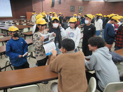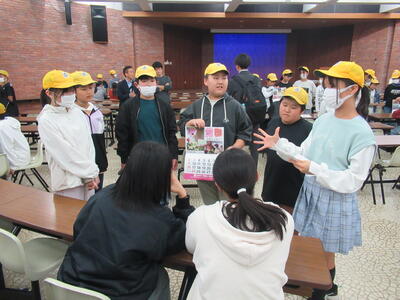 これまでのふるさと学習の成果を自作の「岡富カレンダー」にまとめ、約30名の大学生に延岡の魅力自慢をしてきました。5人1グループになり、延岡の美しい山々やビーチ、清流、寺社、お祭りやイベント、グルメ等について、カレンダーの写真を示したり、クイズにしたりしながらPRしていました。