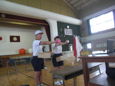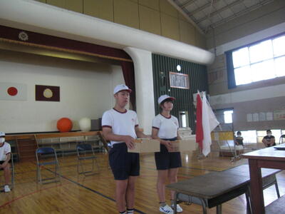 体育館に、5・6年生が集まり、運動会の団決定集会が行われました。6年生が箱の中からカラーボールを引き、赤団、白団が決定しました。その後、校長先生から各団に団旗が手渡され、赤団、白団ともに運動会に向けての決意表明の挨拶をしました。