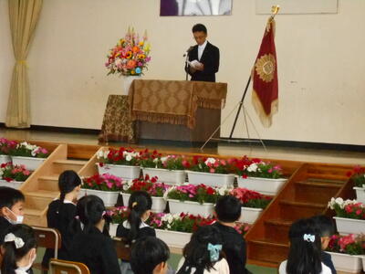 校長先生のお話には、新入生に分かりやすいように『機関車トーマス』の絵本の内容が取り上げられていました。「トーマスは、友だちのパーシー、エドワード、ほかにもたくさんの仲間たちと、笑ったり泣いたり、時にはケンカをしたり、友だちの輪が広げていきました。新入生のみなさんも、優しく、たくましく、賢くなってほしい。これから、友だちの輪を広げていきましょう。」というもので、新入生も最後まで静かにお話が聞けていました。