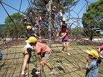 行き先は・・・日向市の小倉ヶ浜総合公園です。この公園には、海賊船やクモの巣の遊具があり、みんな夢中になって遊びました。他にも鬼ごっこや松ぼっくりを使ったお店屋さんごっこなど、元気いっぱい遊びました。そのせいか、「先生お腹へりました~」の声・声・声。予定を30分繰り上げて、お弁当をいただきました。