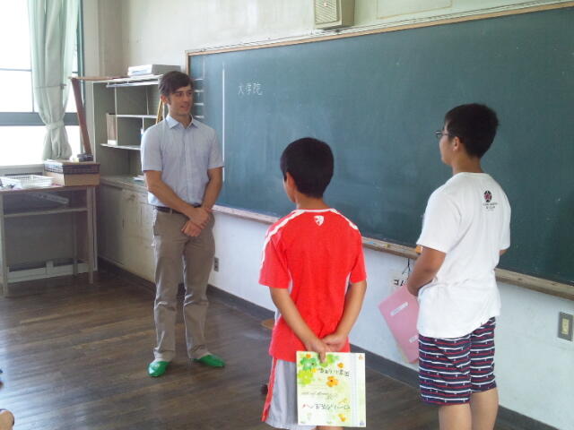 ローリック先生は、日本の大学で英語を教えたいという夢があり、いったんアメリカに帰国し、大学院に進学されます。その夢を6年生の子どもたちに、熱く語っていただきました。