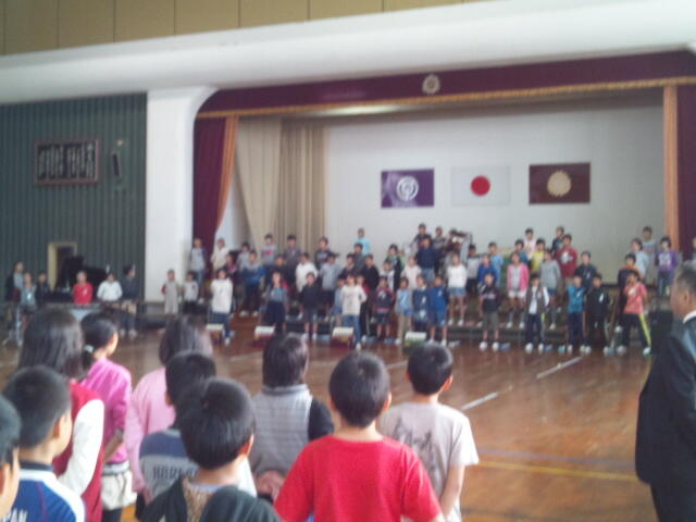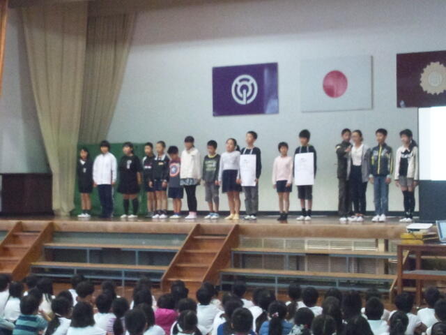 11月10日(火)の朝の時間に発表集会を行いました。今月は5年生の発表でした。13日に行われる延岡市小・中音楽祭で発表する合唱「地球をつつむ歌声」合奏「ニンジャリバンバン」を全校児童の前で発表しました。5年生の歌声や発表態度がとても素晴らしかったです。本番でも岡富小学校の代表としてがんばって欲しいです。