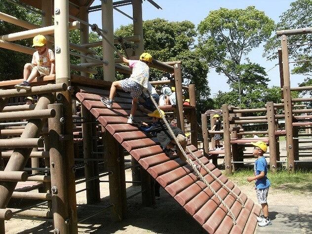 1年生にとっては、小学生になって初めての遠足でした。学校から歩いて城山公園に行きました。初めにアスレチックスでたくさん遊びました。それで十分満足したのか、「お腹すいたあ。」「お弁当はまだですか。」という声があちこちから聞こえてきました。「まだです。もう少ししてからね。」と答えるととても残念そうでした。その後、広場に移り自然散策や自由遊びを行いました。おにごっこをしたり、日陰の地面にお絵かきしたりして過ごしました。待ちに待ったお弁当の時間には、どの子も嬉しそうに食べていました。気温が高かった上にたくさん歩いたり遊んだりしたのできっと夜はぐっすり眠れたことと思います。