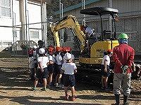 作業の休息中、ショベルカーに大はしゃぎの1年生でした。